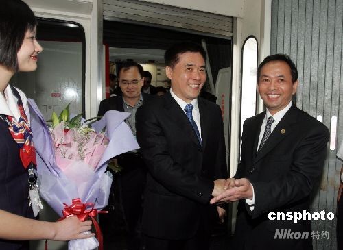 6月23日下午,臺(tái)北市長郝龍斌抵達(dá)上海浦東國際機(jī)場,開始對上海進(jìn)行為期5天的訪問,這是新中國成立以來,臺(tái)北市長首次訪問上海。圖為上海市臺(tái)辦主任楊建榮(右)到機(jī)場迎接。 中新社發(fā) 潘索菲 攝