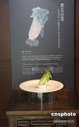 六月二十五日,臺北故宮院內的飲食中心推出“國寶宴”,把觀光客游故宮最喜愛的幾件文物,都作成精致餐點端上桌,使游客在觀賞完故宮珍寶、大飽眼福之后,可以到此繼續大飽口福。圖為服務員端上“翠玉白菜”。 中新社發 耿軍 攝