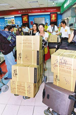 據臺灣《中國時報》報道,“怕行李超重不敢多買,”蘇州中國國際旅行社總經理丁海洋在離臺時指出,34名團員都買了茶葉、鳳梨酥等伴手禮,還有人買了紅珊瑚、琉璃,至少花了100萬(新臺幣,下同),平均每人血拼3萬元。