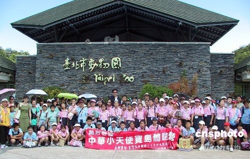 來自北京中關(guān)村第三小學(xué)的近百位“中華小天使”七月十五日在臺灣展開寶島夏令營行程,創(chuàng)下兩岸兒童交流人數(shù)最多的紀錄。此次來臺的小朋友平均年齡在十一歲左右,由十六位老師帶領(lǐng),他們于十四日抵達臺灣,在臺行程九天八夜。圖為在參觀臺北市立動物園前合影。 中新社發(fā) 徐長安 攝