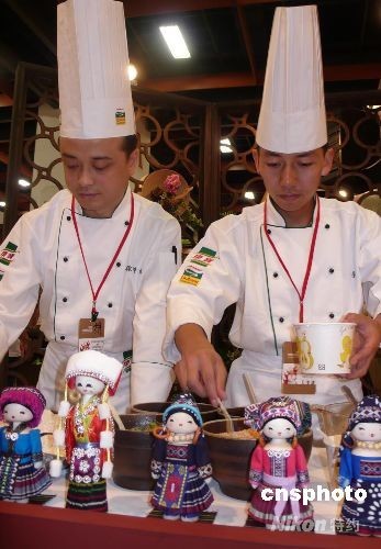 “二00八臺灣美食展”八月十五日在臺北開幕。來自貴州的黔菜展區(qū),展示了貴州菜“絲娃娃”、苗家酸魚湯等十二道菜,貴州師傅徐靜松、袁平還現(xiàn)場示范制作紅油米豆腐、糕粑稀飯,讓觀眾見識辣、酸、鮮、野的黔菜風味。 中新社發(fā) 曾嘉 攝