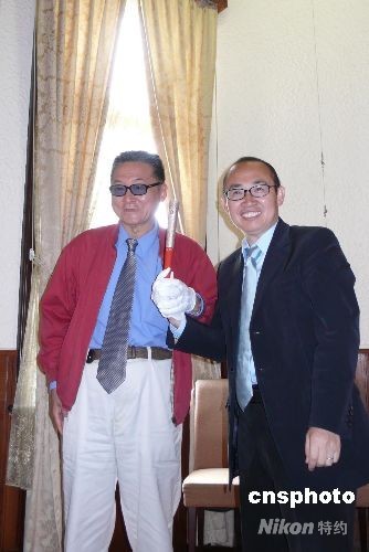臺灣知名學者李敖與大陸知名地產(chǎn)商潘石屹十八日在臺北舉行對談活動,吸引媒體采訪。圖為對談結束后,潘石屹贈送李敖北京奧運祥云火炬紀念品。 中新社發(fā) 曾嘉 攝
