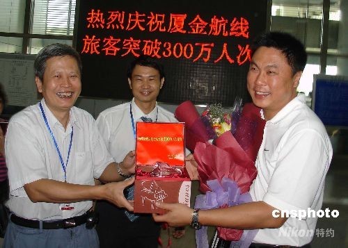 中新社廈門九月十九日電(楊伏山 葉明亮)二○○一年一月二日正式開通的廈金航線,十九日迎來累計運送出入境旅客人數突破三百萬人次大關的值得紀念的日子。