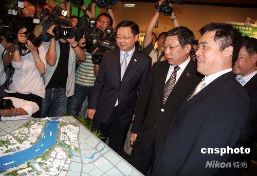 9月22日,“2010上海世界博覽會(huì)推介會(huì)”暨“走進(jìn)世界博覽會(huì)”展覽活動(dòng)在臺(tái)北開幕。出席開幕式的臺(tái)北市市長(zhǎng)郝龍斌(右一)、上海常務(wù)副市長(zhǎng)楊雄(右二)一起參觀上海世博會(huì)整體規(guī)劃展覽。 中新社發(fā) 陳立宇 攝