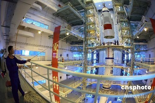 備受矚目的神舟七號載人航天飛行任務實施在即,目前,飛船、火箭、逃逸塔已在酒泉衛星發射中心總裝測試廠房順利完成對接。 中新社發 楊志遠 攝