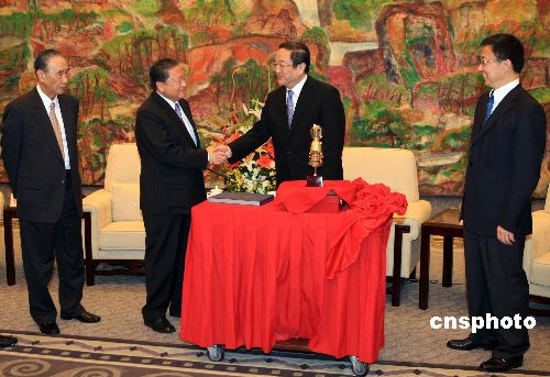 11月6日晚,中共中央政治局委員、上海市委書記俞正聲(圖右二)與市委副書記、市長韓正(右一)在上海西郊賓館會(huì)見了臺(tái)灣大企業(yè)董事長參訪團(tuán)一行 該參訪團(tuán)由臺(tái)達(dá)集團(tuán)董事長鄭崇華、國泰世華銀行董事長汪國華、遠(yuǎn)東集團(tuán)董事長徐旭東、英業(yè)達(dá)集團(tuán)董事長李詩欽等“重量級”臺(tái)商組成。會(huì)后,俞正聲與韓正向臺(tái)灣大企業(yè)董事長參訪團(tuán)贈(zèng)送了神舟七號飛船實(shí)體模型和神舟七號航天郵品等紀(jì)念品。 中新社發(fā) 湯彥俊 攝