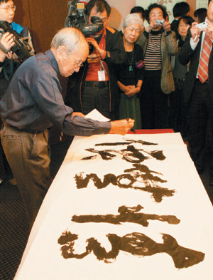 書法大師愛新覺羅·毓嶦18日在臺北信義誠品舉行訪臺記者會,并當眾揮毫“情無價”。圖片來源:臺灣《聯合報》