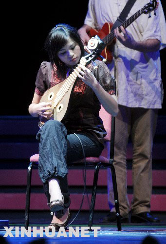 11月26日,臺灣“絲竹空”爵士樂團在表演爵士樂《鳳陽》。 當日,首屆海峽兩岸(廈門)文化產業博覽交易會開幕式文藝晚會在廈門人民會堂舉行,來自海峽兩岸的藝術家同臺演出,共敘文緣。 新華社記者 姜克紅 攝