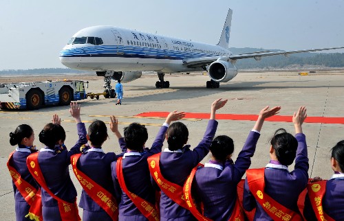12月18日,廈門航空地面乘務(wù)人員在福州長樂國際機(jī)場為兩岸空中直航包機(jī)送行。 當(dāng)日12時40分,搭乘著196名乘客的兩岸空中直航包機(jī)從福州長樂國際機(jī)場首飛臺北松山機(jī)場,標(biāo)志福州至臺灣空中客運(yùn)直航正式開通。 新華社記者 張國俊 攝