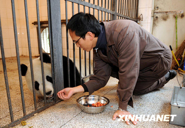 12月21日,臺北木柵動物園飼養(yǎng)員王進治在訓(xùn)練“團團”。新華社記者陳燮攝