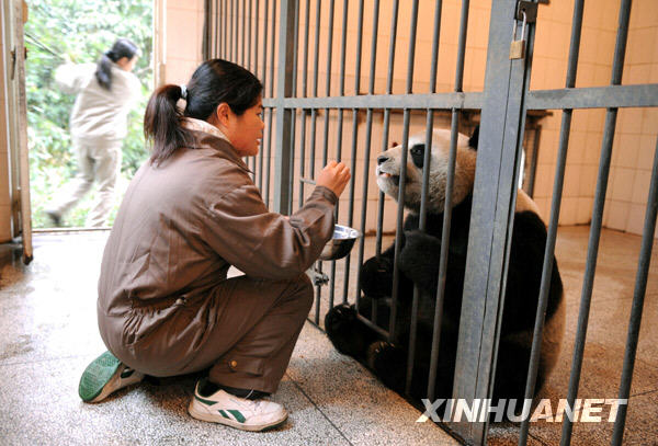 從2008年10月開始,臺北木柵動物園的3名飼養(yǎng)員分兩批來到中國保護大熊貓研究中心四川雅安碧峰峽基地,學(xué)習(xí)大熊貓飼養(yǎng)技術(shù)。目前,他們和贈臺大熊貓“團團”“圓圓”已經(jīng)建立感情,基本掌握了大熊貓飼養(yǎng)技術(shù)。新華社記者陳燮攝