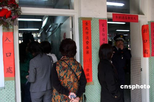 1月18日上午,備受全臺和外界關注的消費券開始在臺灣各發放所發放。圖為設于臺北市光復小學內的第1228號消費券發放所民眾正在排隊領取消費券。 中新社發 陳立宇 攝