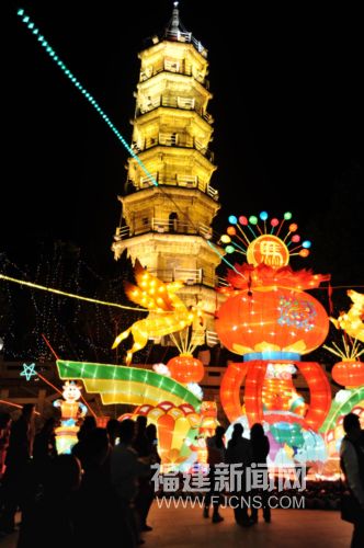 二月四日晚,披上節日盛裝、頗具歷史的福州市馬尾羅星塔,與周圍剛剛亮燈的“鼓舞兩馬”、“兩馬同春”等大型花燈交相輝映。