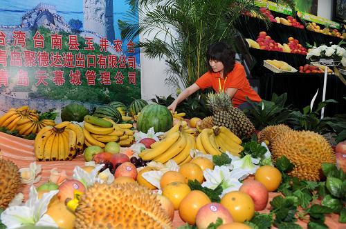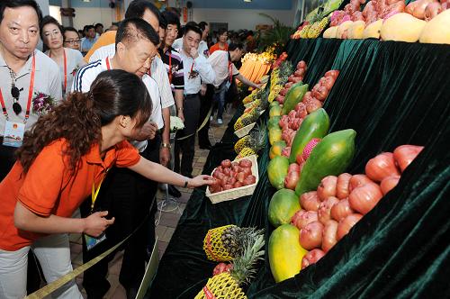 5月30日,工作人員在為客商介紹臺灣水果。當日,青島“海峽兩岸精品水果展”開幕。參展臺灣水果直接從臺灣省臺南縣玉井鄉運抵青島,包括芒果、蓮霧、番石榴、鳳梨等10多個品種,吸引眾多商家前來洽談。新華社記者 李紫恒 攝