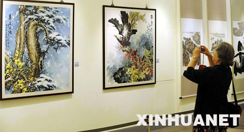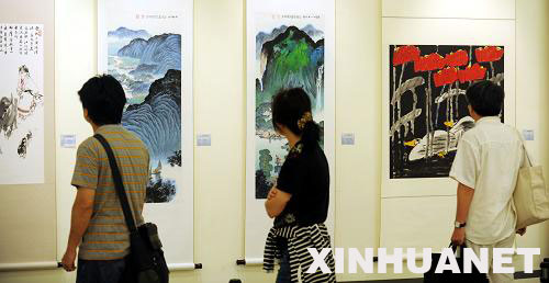 6月6日,2009當代國畫名家作品展在臺北市開幕,展出兩岸國畫名家作品140幅。中國國民黨主席吳伯雄與來自大陸的中國美術家協會主席劉大為等為畫展剪彩揭幕。這是參觀者在觀看畫展。新華社發(吳景騰 攝)