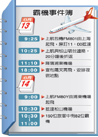新華網消息 據臺灣《聯合報》報道,上海航空原訂前天從上海飛松山的FM801班機,因途中遇雷雨,機長返航,延至14日才抵達,旅客被迫在上海多滯留一晚。飛機抵達松山后,80名旅客憤不下機,經民航部門斡旋才結束約半小時的霸機,也成為兩岸直航以來首宗霸機事件。