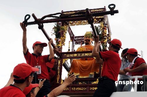 中新社福州六月二十八日電(記者 劉可耕)二十八日下午,由福州晉安區“閩臺王審知研究會”組織的福州市閩王金身巡安臺灣暨宗親文化交流訪問團一行圓滿結束為期十天的閩王金身首次跨海巡安臺灣本島交流活動,搭乘“金龍輪”經“兩馬”航線返回福州。