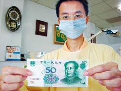 牙醫(yī)師何正忠手上拿的50元人民幣,是大陸遲緩兒唐正跳繩獲得的獎(jiǎng)勵(lì)金,他要捐給臺(tái)灣災(zāi)民。圖片來源:臺(tái)灣《中國(guó)時(shí)報(bào)》