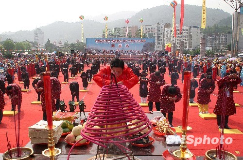 9月9日上午,數百名兩岸信眾在福建省順昌縣參加古香古色的齊天大圣祭祀大典。這里是齊天大圣信仰文化發祥地,當天,首屆海峽兩岸齊天大圣文化旅游節在這里開幕,有200多位臺灣信眾前來參加。 中新社發 周文杰 攝