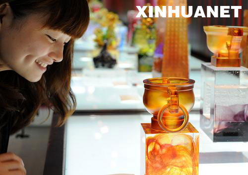 9月17日,一名觀眾在觀賞臺灣琉璃工藝品。