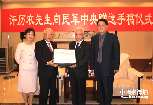 中國臺灣網(wǎng)10月21日北京消息 今天上午,臺灣新同盟會會長許歷農(nóng)捐贈手稿儀式在民革中央舉行。出席捐贈儀式的全國人大常委會副委員長、民革中央主席周鐵農(nóng)對許歷農(nóng)的手稿予以高度肯定。他并表示,這些珍貴的手稿對于進(jìn)一步研究兩岸關(guān)系,繼續(xù)推動兩岸和平發(fā)展,都具有十分重要的作用。