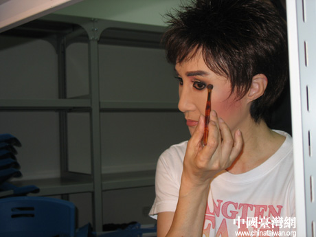 臺灣歌仔戲演員在后臺精心化妝。(中國臺灣網(wǎng) 徐麗麟 攝)