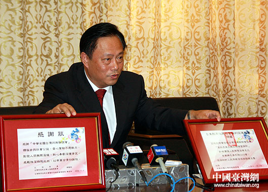 11月6日至10日,全國臺聯(lián)會長梁國揚率團赴臺交流參訪,為臺灣少數(shù)民族鄉(xiāng)親送去賑災(zāi)款物。11月19日,梁國揚回京后向記者通報此行參訪交流情況,并展示臺灣少數(shù)民族鄉(xiāng)親回送給全國臺聯(lián)的感謝狀等。(中國臺灣網(wǎng) 鐘寶華 攝)