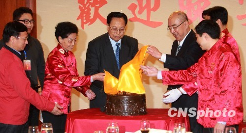 12月14日晚,國民黨榮譽主席吳伯雄在臺北圓山飯店接待河南省人大常委會主任徐光春所率領(lǐng)的訪問團一行。訪問團成員包括河南副省長孔玉芳、省委秘書長曹維新、開封市委書記劉長春、平頂山市委書記趙頃霖、安陽市委書記張廣智等人。 中新社發(fā) 趙勇 攝