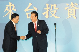 海協會和臺灣;鶗蛱炫e行陸資赴臺投資座談會,;鶗麻L江丙坤(左)與海協會長陳云林(右)出席,向兩岸企業喊話招商。來源:臺灣《聯合報》