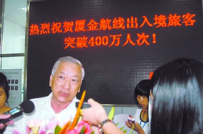 2009年7月10日,陳信仲作為廈金航線第400萬名旅客正在接受媒體采訪。 葉明亮 鄭曉強(qiáng) 攝 (資料圖片)