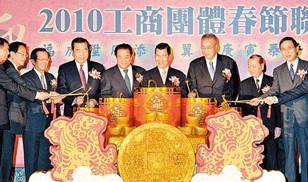 工商團體10日舉行新春團拜,蕭萬長﹙中﹚、吳敦義﹙右4﹚及工商團體負責人共同出席與會。圖片來源:中國時報