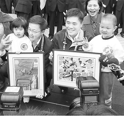 韓正(左二)、郝龍斌在臺北幼兒園與小朋友合影。王連偉攝