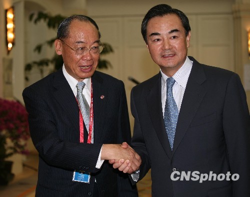 中共中央臺(tái)辦、國務(wù)院臺(tái)辦主任王毅4月10日在海南博鰲為前來出席博鰲亞洲論壇2010年年會(huì)的臺(tái)灣兩岸共同市場基金會(huì)最高顧問錢復(fù)一行舉辦招待酒會(huì)。 中新社發(fā) 王辛莉 攝