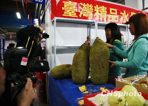4月26日,在河北正定縣小商品博覽會上,300個家臺企的數千種商品亮相。在臺灣展區展銷的水果、小食品、飾品、服裝等特色商品受到游人歡迎。圖為來自寶島臺灣的精品水果“菠蘿蜜”其碩大的體形吸引了媒體的眼球。 中新社發 翟羽佳 攝