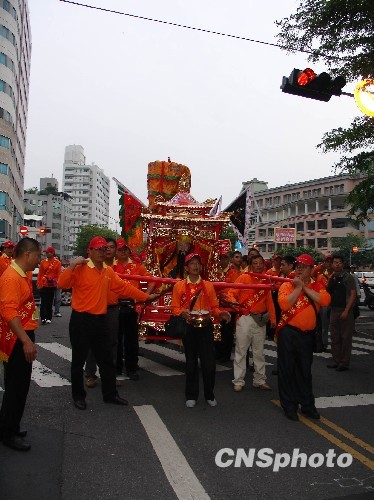 4月28日,農(nóng)歷十五,適逢兩岸民眾共同信奉的保生大帝1032年圣誕。大陸廈門海滄青礁慈濟祖宮保生大帝金身蒞臨臺灣,展開繞境巡邏。圖為保生大帝圣駕在臺中市繞境巡游。 中新社發(fā) 楊伏山 攝