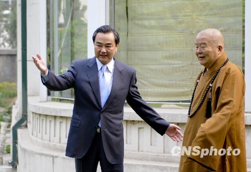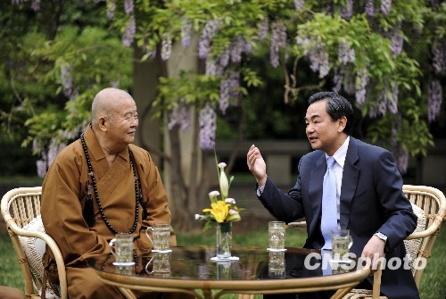 5月14日,國臺辦主任王毅邀請臺灣星云法師在北京釣魚臺國賓館的草坪上茶敘。 中新社發 廖攀 攝