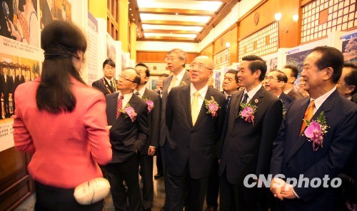 “天府四川寶島行”啟動儀式暨經貿合作論壇5月24日上午在臺北舉行。中共四川省委書記劉奇葆、中國國民黨榮譽主席吳伯雄及兩岸工商、文化、教育等各界人士出席論壇。汶川大地震兩周年取得的災后重建成果贏得了兩岸嘉賓陣陣掌聲。圖為劉奇葆、吳伯雄等參觀四川省情圖片展。 中新社發 鄒輝 攝