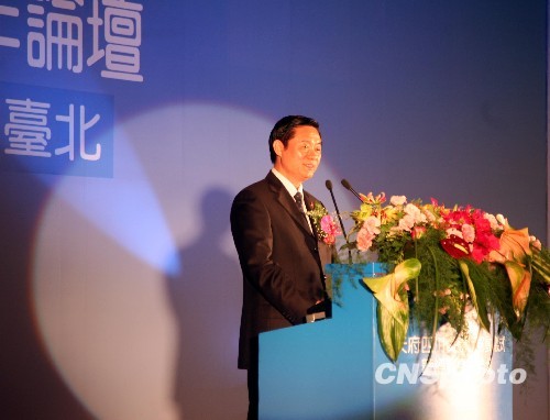 “天府四川寶島行”啟動儀式暨經貿合作論壇24日上午在臺北舉行。中共四川省委書記劉奇葆、中國國民黨榮譽主席吳伯雄及兩岸工商、文化、教育等各界人士出席論壇。汶川大地震兩周年取得的災后重建成果贏得了兩岸嘉賓陣陣掌聲。圖為劉奇葆在論壇上致辭。 中新社發 鄒輝 攝