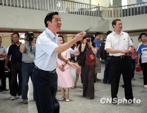 5月26日,在臺灣參訪的中共四川省委書記劉奇葆一行到“9·21”地震災區南投縣參觀考察,圖為他走訪埔里小學時與學生打羽毛球。 中新社發 鄒輝 攝