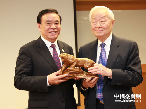 呂祖善贈(zèng)送東陽(yáng)老虎木雕給臺(tái)積電董事長(zhǎng)張忠謀。(浙江省臺(tái)辦 王健 攝)