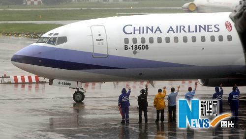 當日,上海虹橋—臺北松山航線正式開通。早上8點57分,滿載乘客的臺灣華航CI201航班從臺北松山機場起飛,飛往上海虹橋機場。新華社記者 費茂華 攝
