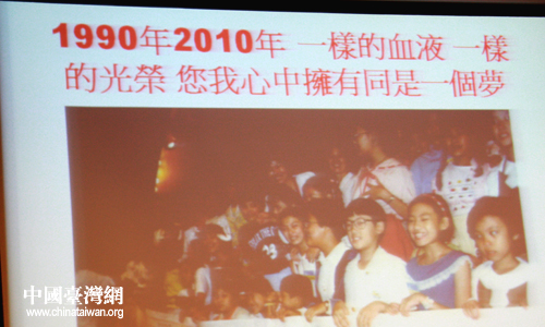 翁林澄還指著一張兩岸小天使們的合影說道,你能告訴我他是來自北京嗎?他是在高雄的下一代嗎?翁林澄說:“我們兩岸的中國人都是一樣的臉孔一樣的光榮,我們對下一代寄予更大的厚望。”