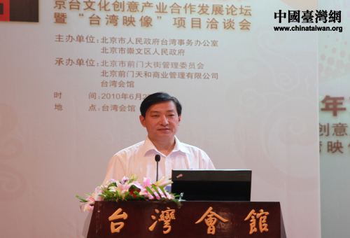 中國臺灣網6月22日北京消息 由北京市人民政府臺灣事務辦公室、崇文區人民政府主辦,北京市前門大街管理委員會、北京前門天和商業管理有限公司、臺灣會館承辦的 “2010年京臺文化節——京臺文化創意產業合作發展論壇暨‘臺灣映像’項目洽談會”,今天在重新開張的臺灣會館舉行。國臺辦交流局副局長嚴中洲、北京市臺辦主任馬玉萍、崇文區區長牛青山、北京市臺辦副主任黃塞溪、崇文區副區長周永明等領導出席了此次活動。臺北市文化創意產業參訪團、在京文創企業代表、北京臺資企業協會代表,以及來自臺北、上海等地的臺企代表等共100余人參加論壇活動。