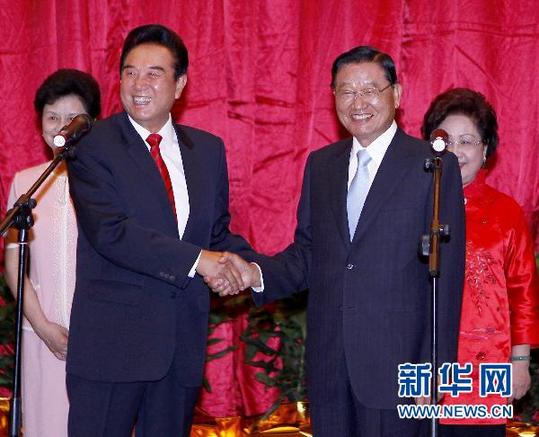 6月28日,由江丙坤董事長率領(lǐng)的海基會(huì)協(xié)商代表團(tuán)一行抵達(dá)下榻的重慶申基索菲特大酒店,受到海協(xié)會(huì)會(huì)長陳云林的熱情歡迎。這是陳云林(前左)和江丙坤(前右)在歡迎儀式上握手。新華社記者陳建力攝