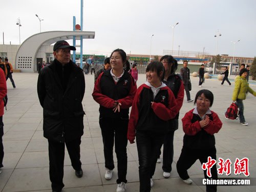 2010年4月,新華愛心教育基金會理事長張君達到赤峰第二實驗中學訪問,受到“珍珠生”的歡迎。(圖片由孫立極提供)