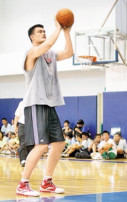 姚明27日赴裕隆球場練球,身形高大的他在球場上顯得鶴立雞群,引人注目。圖片來源:臺灣《中國時報》