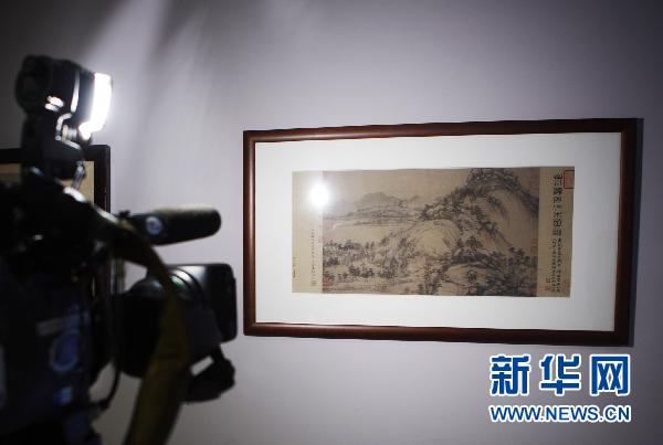7月29日,電視記者在發布會舉行前拍攝《剩山圖》的復制品。當日,臺北故宮博物院院長周功鑫在此間宣布,臺北故宮將于2011年6月至9月推出“山水合璧——黃公望與富春山居圖特展”,重現元代畫家黃公望曠世杰作《富春山居圖》的原貌。 新華社記者 費茂華 攝