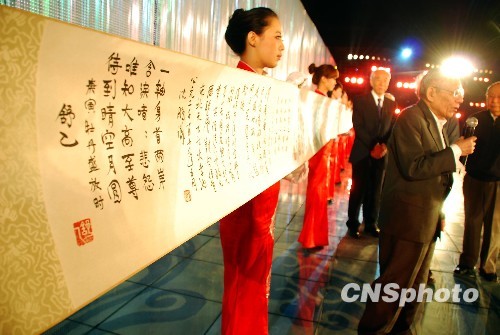 5月15日晚,珍藏在海峽兩岸博物館的《富春山居圖》在北京太廟通過屏幕實現(xiàn)“合璧”。中央文史研究館館長袁行霈為活動致辭,并與館員歐陽中石、程毅中、沈鵬、傅熹年、侯德昌、舒乙一起為高仿真的《富春山居圖》題跋。 中新社發(fā) 楊慧峰 攝