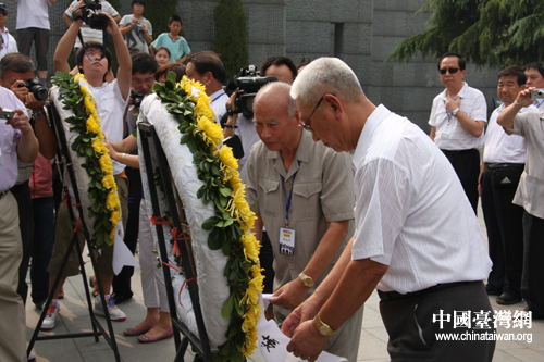 海內(nèi)外黃埔軍校同學(xué)會的校友、親屬、專家學(xué)者向遇難同胞敬獻花圈。(中國臺灣網(wǎng) 肖燕 攝)