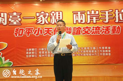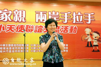 8月21日晚,閩臺(tái)一家親 兩岸手拉手第十二屆和平小天使聯(lián)誼交流聯(lián)歡會(huì)在福州舉辦。福建省副省長(zhǎng)陳樺女士參加了此次聯(lián)歡會(huì),聯(lián)歡會(huì)以兩岸小朋友自?shī)首詷返姆绞椒謩e表演了精彩節(jié)的目和游戲。以兩岸孩子共同的文化表現(xiàn)獻(xiàn)愛心、盼和平的無(wú)暇童真,晚會(huì)由福建省臺(tái)聯(lián)黨組書記林衛(wèi)國(guó)主持,全國(guó)臺(tái)聯(lián)文宣部副部長(zhǎng)宋歌、全國(guó)少工委校外教育部副部長(zhǎng)王小軍、福建省臺(tái)聯(lián)副會(huì)長(zhǎng)葉露昆、福建省臺(tái)聯(lián)副會(huì)長(zhǎng)、福州市臺(tái)聯(lián)會(huì)長(zhǎng)陳小凡、省臺(tái)聯(lián)秘書長(zhǎng)張巖,臺(tái)灣中華企劃人協(xié)會(huì)理事長(zhǎng)翁林澄團(tuán)長(zhǎng)、臺(tái)灣創(chuàng)價(jià)學(xué)會(huì)未來(lái)部部長(zhǎng)易汶杏副團(tuán)長(zhǎng)、臺(tái)灣創(chuàng)價(jià)學(xué)會(huì)文教處處長(zhǎng)洪玉柱、臺(tái)灣創(chuàng)價(jià)學(xué)會(huì)副秘書長(zhǎng)謝美珠、臺(tái)灣創(chuàng)價(jià)學(xué)會(huì)文教處企劃部主任林藍(lán)娣等出席聯(lián)歡晚會(huì)。